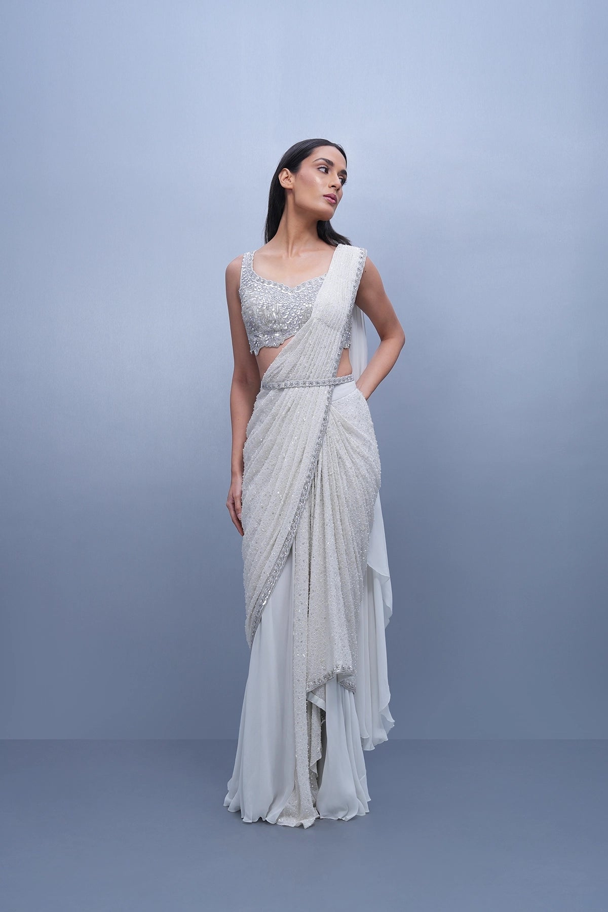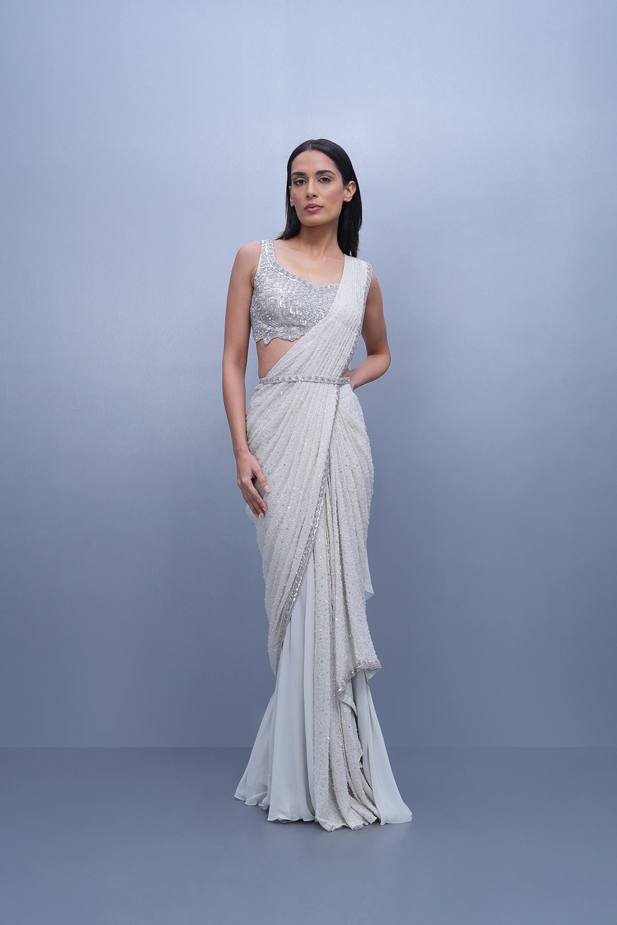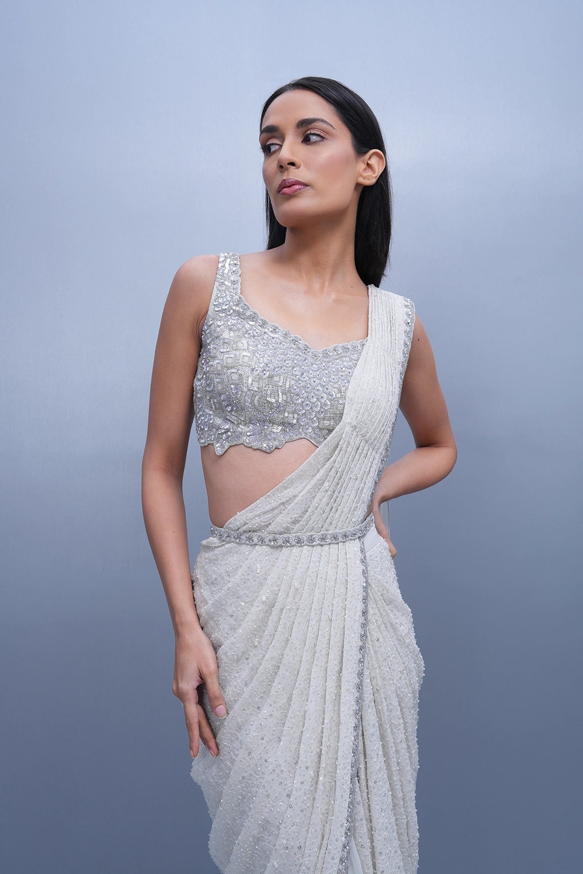 black pre-draped saree with silver and black swarovski lycra pallu and blouse set