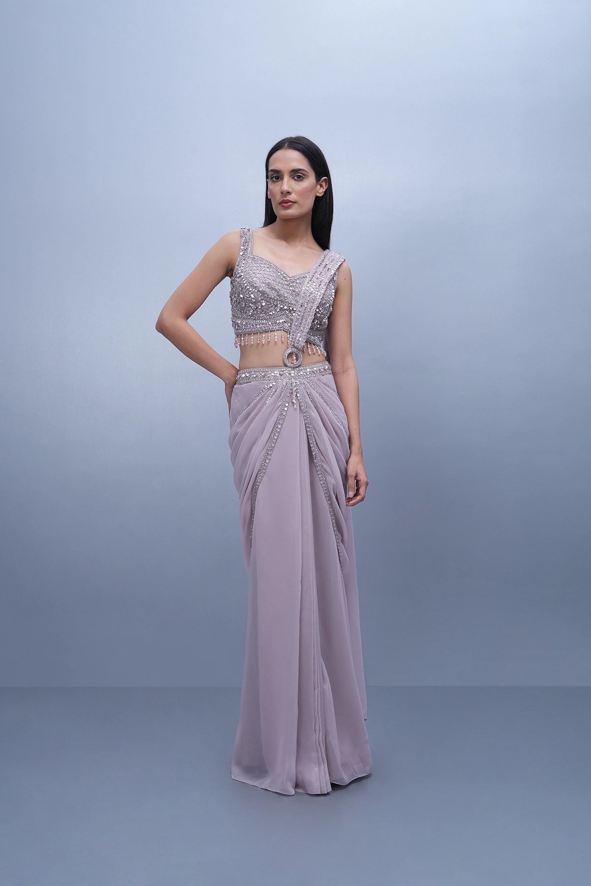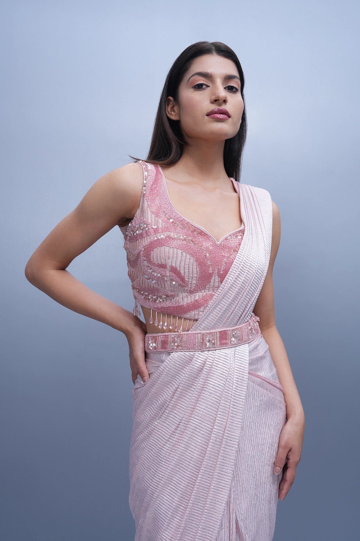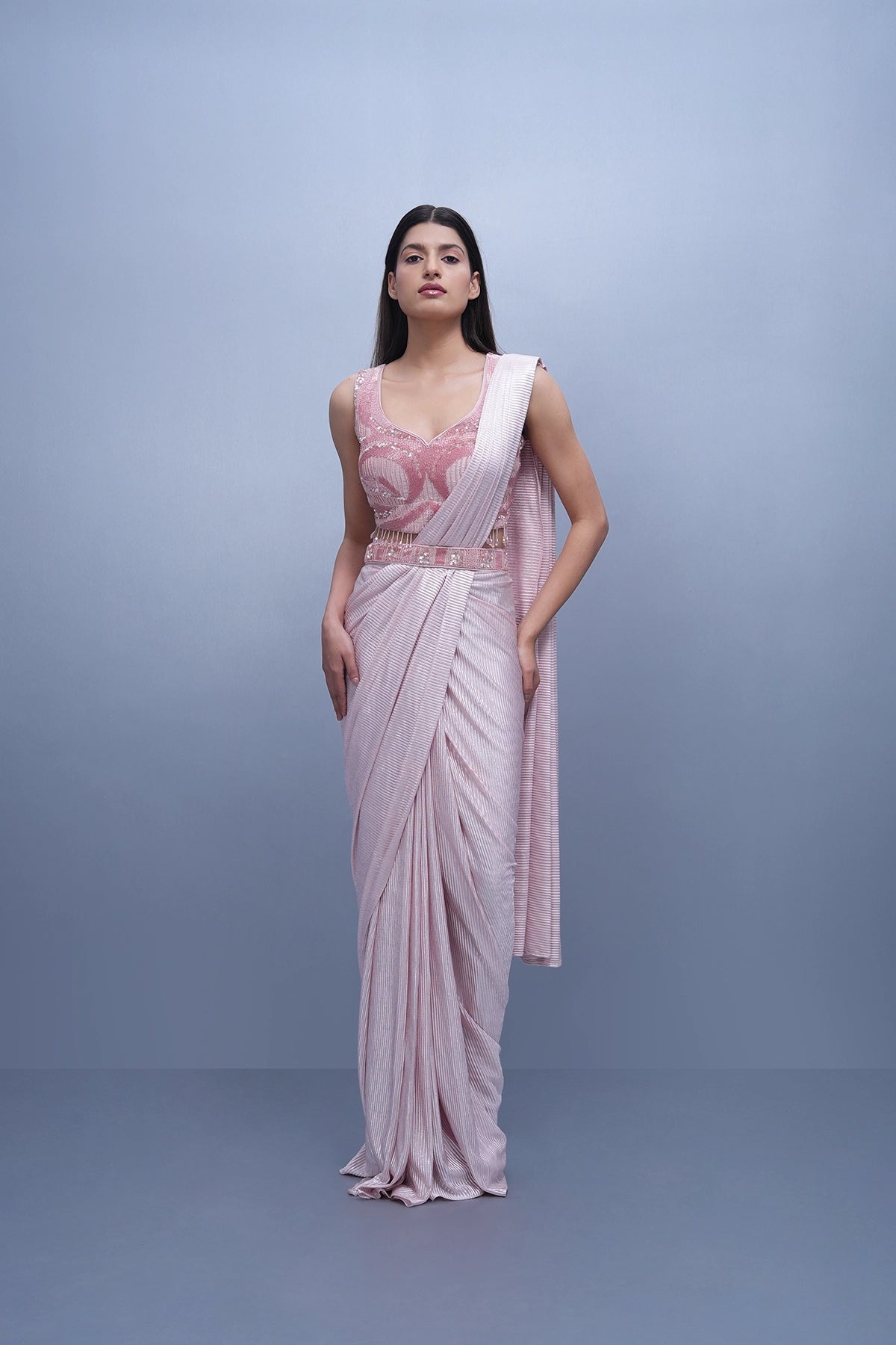 Dusty Pink Corset Blouse Pre-Draped Saree In Lycra
