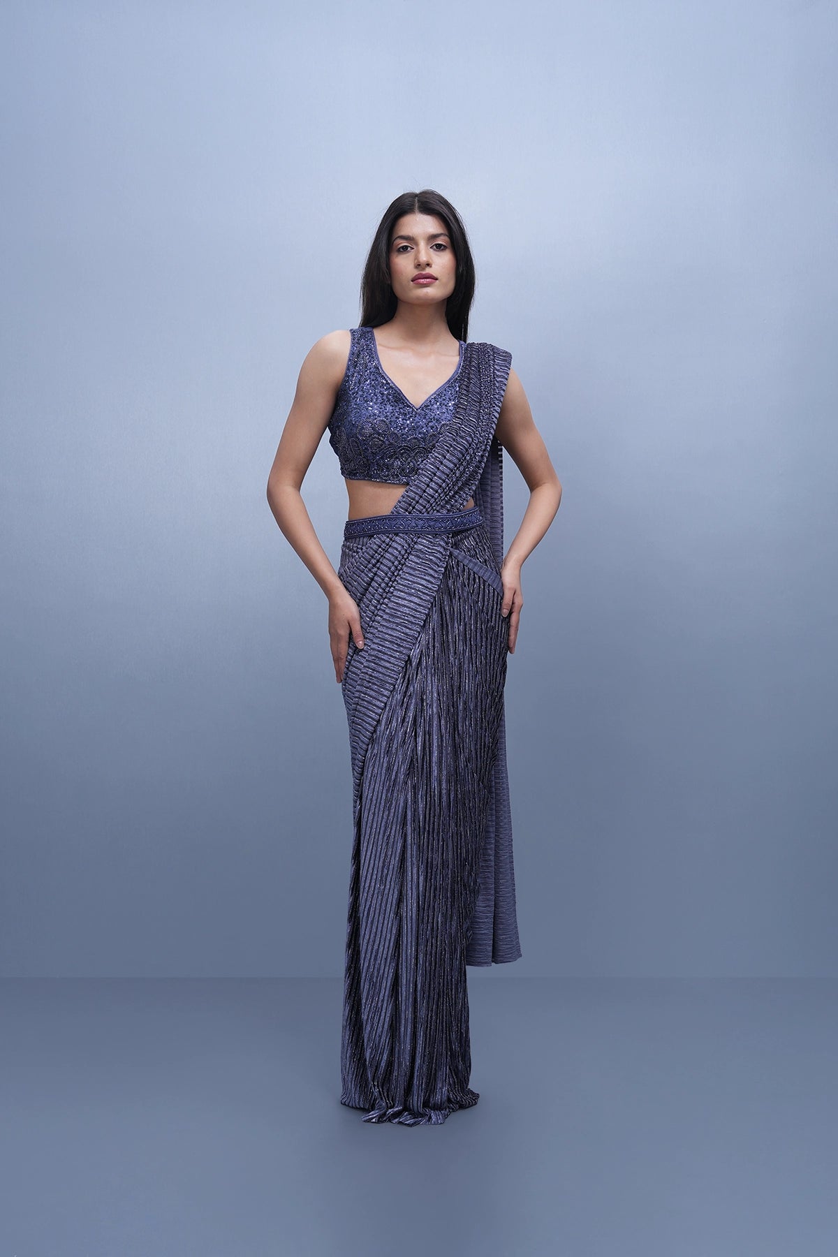 Blueish grey pre-draped saree set in lycra and velvet stripped fabric