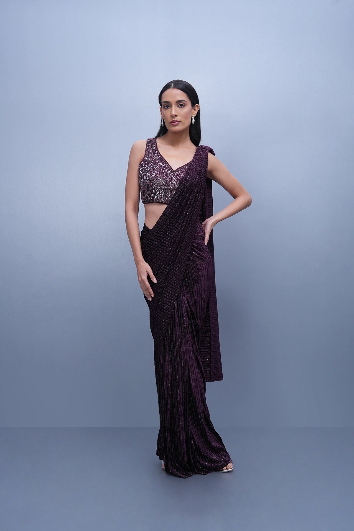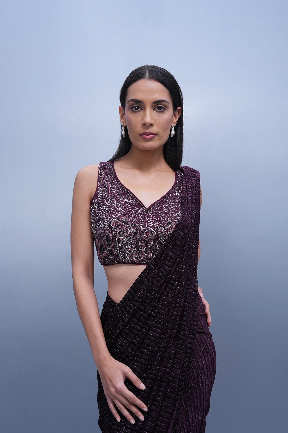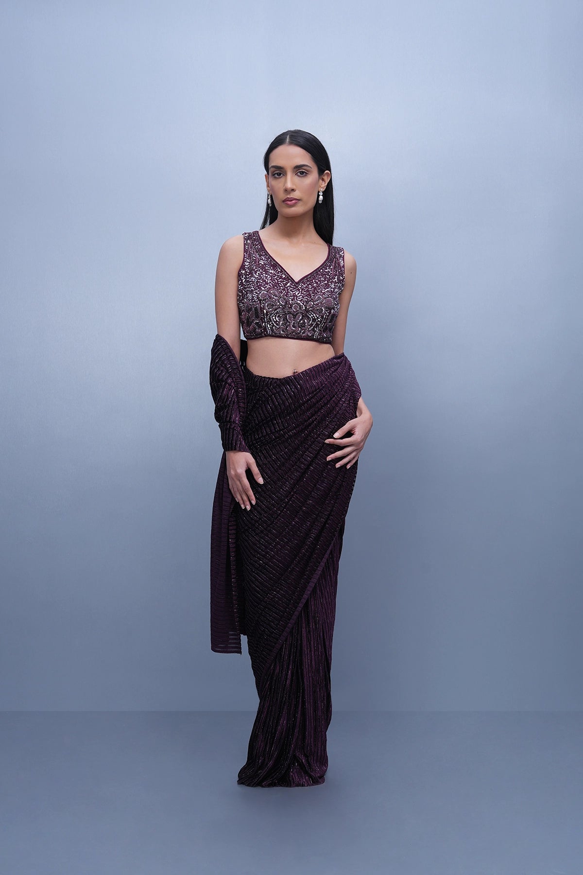 Wine pre-draped saree set in lycra and velvet stripped fabric