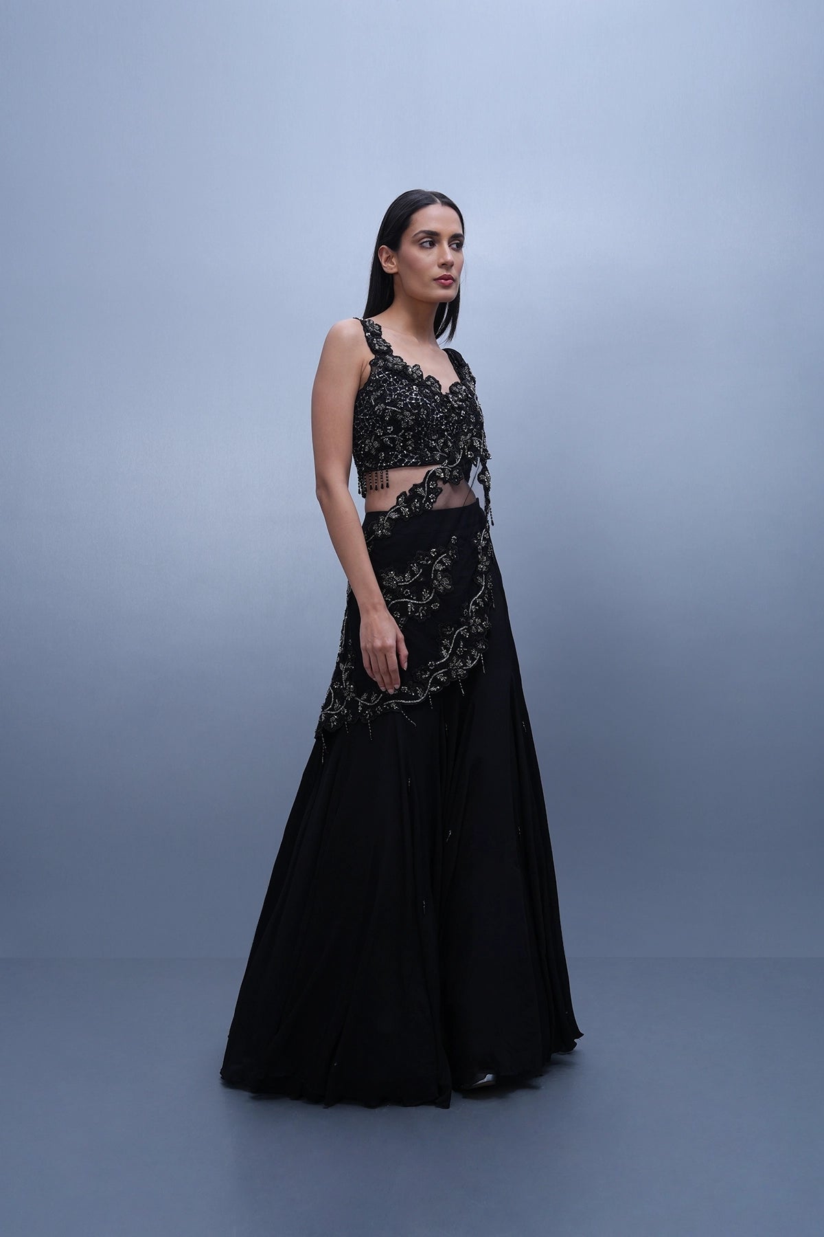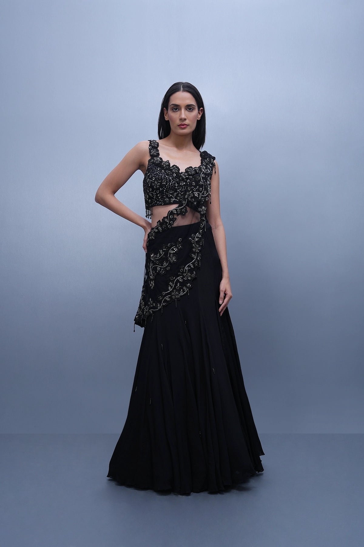Black fishcut lehenga saree set with 3D flower embellishment on the blouse