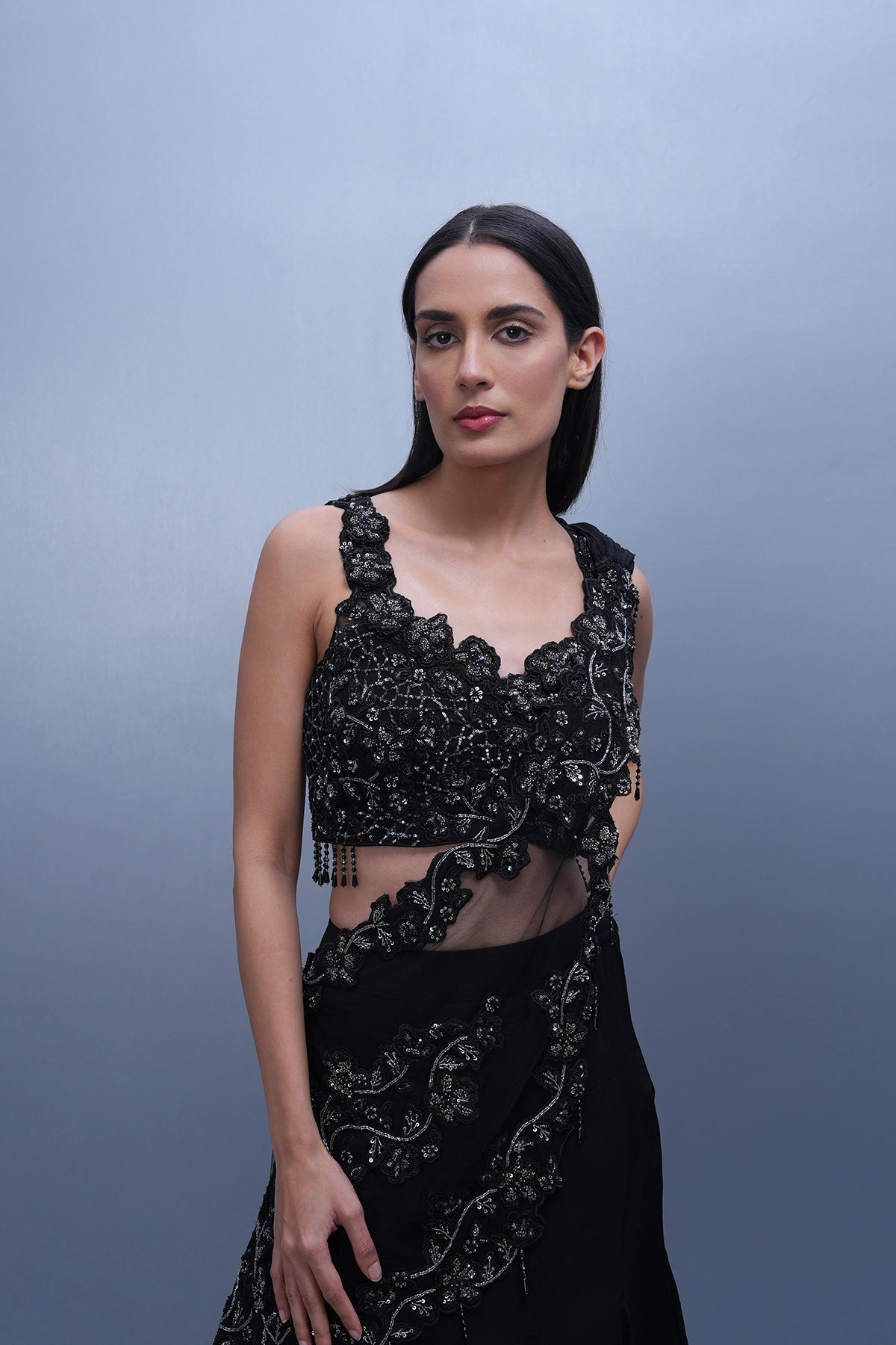 Black pre-draped saree with cutwork pallu and wired blouse set