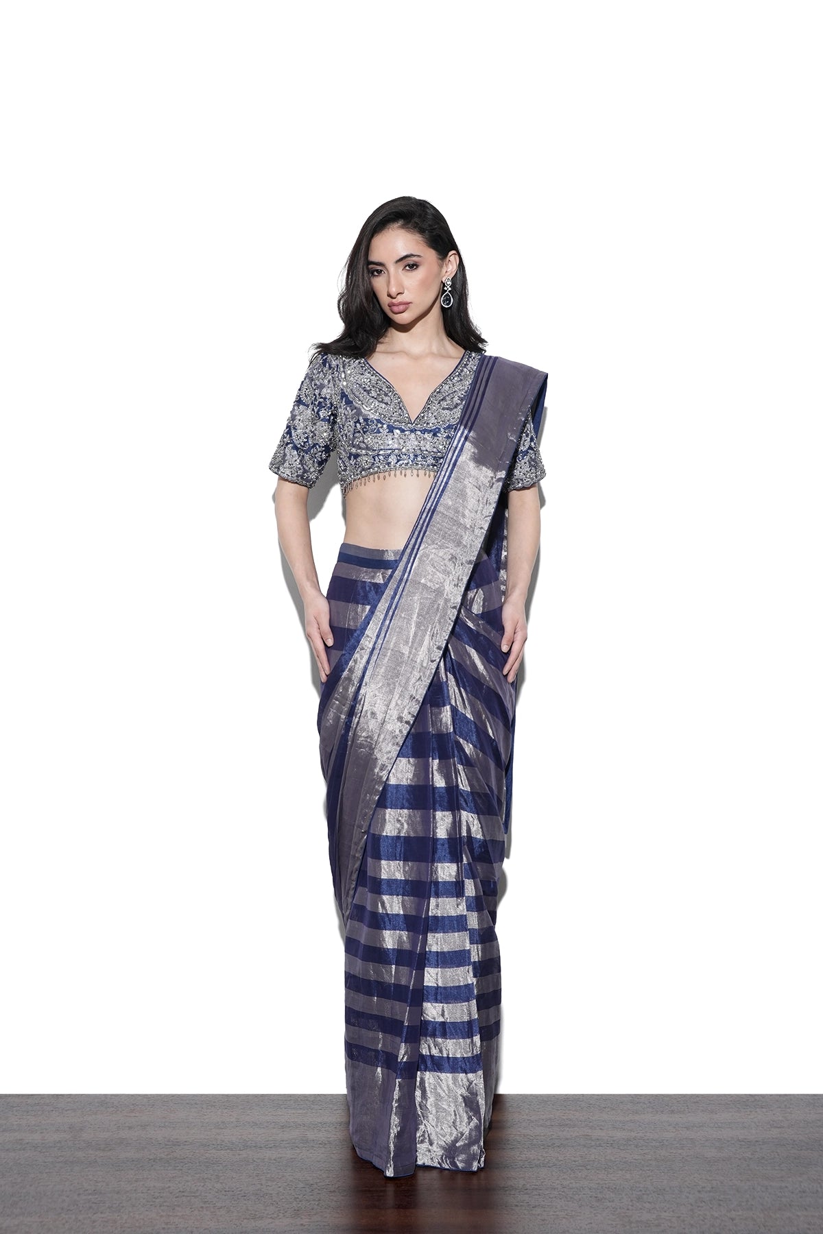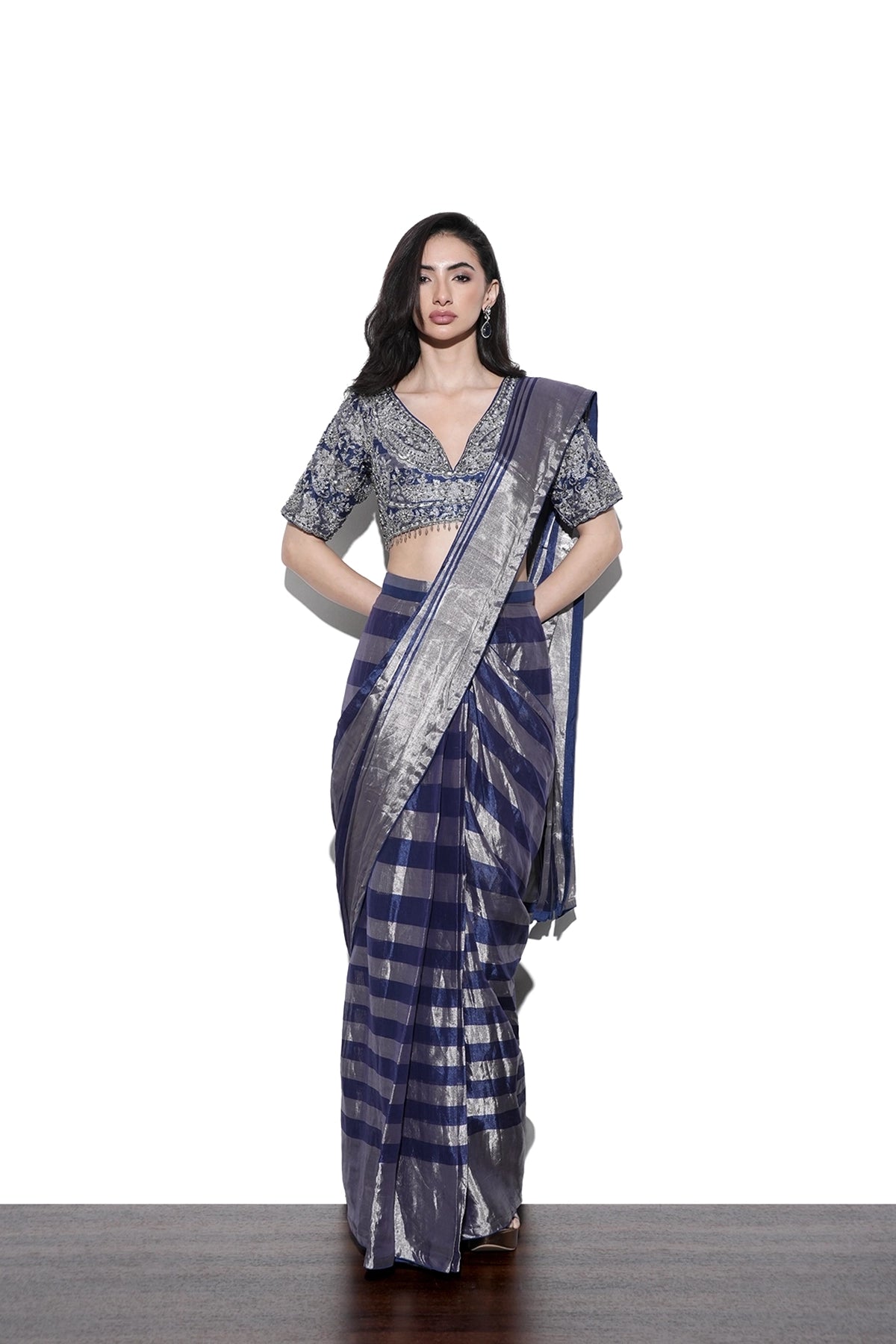 cobalt blue pre-draped saree set with bejeweled gunmetal oxidised blouse