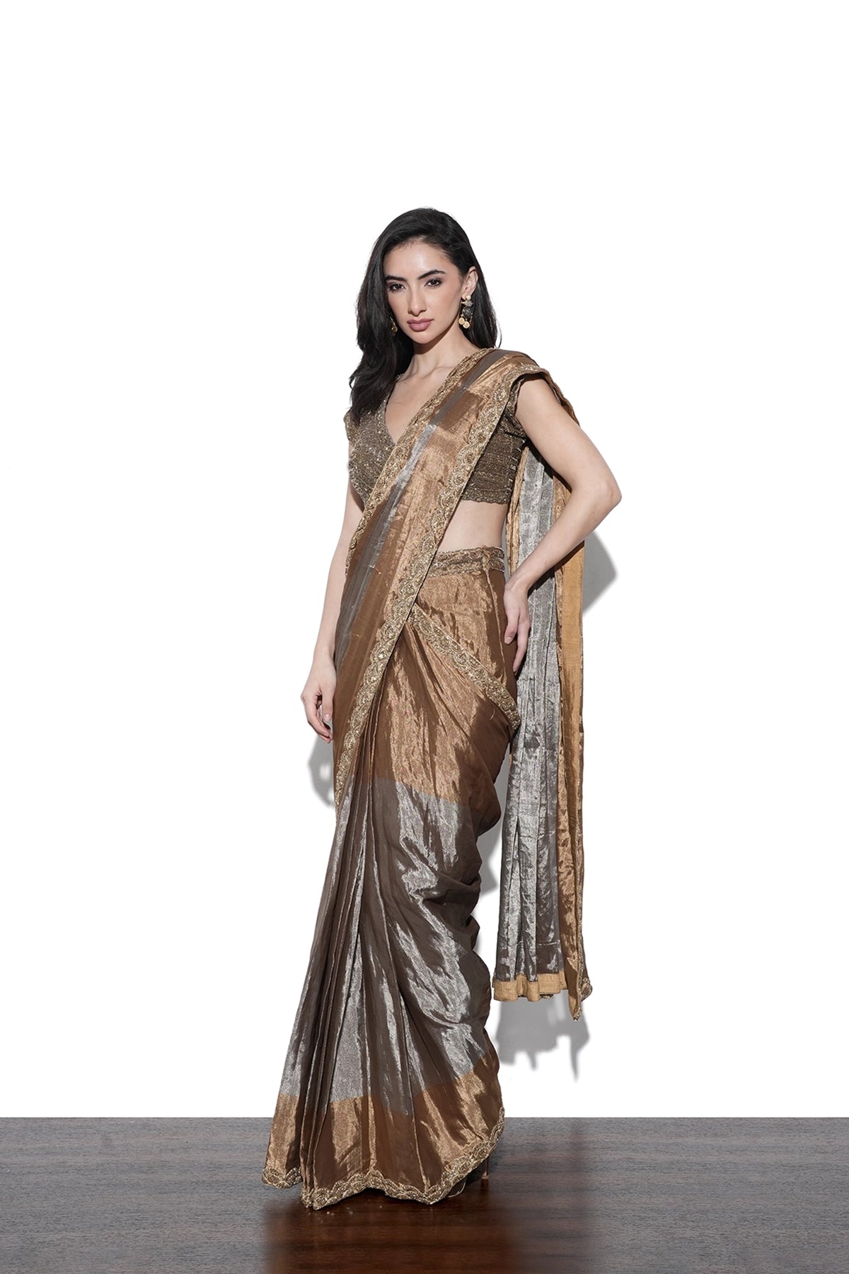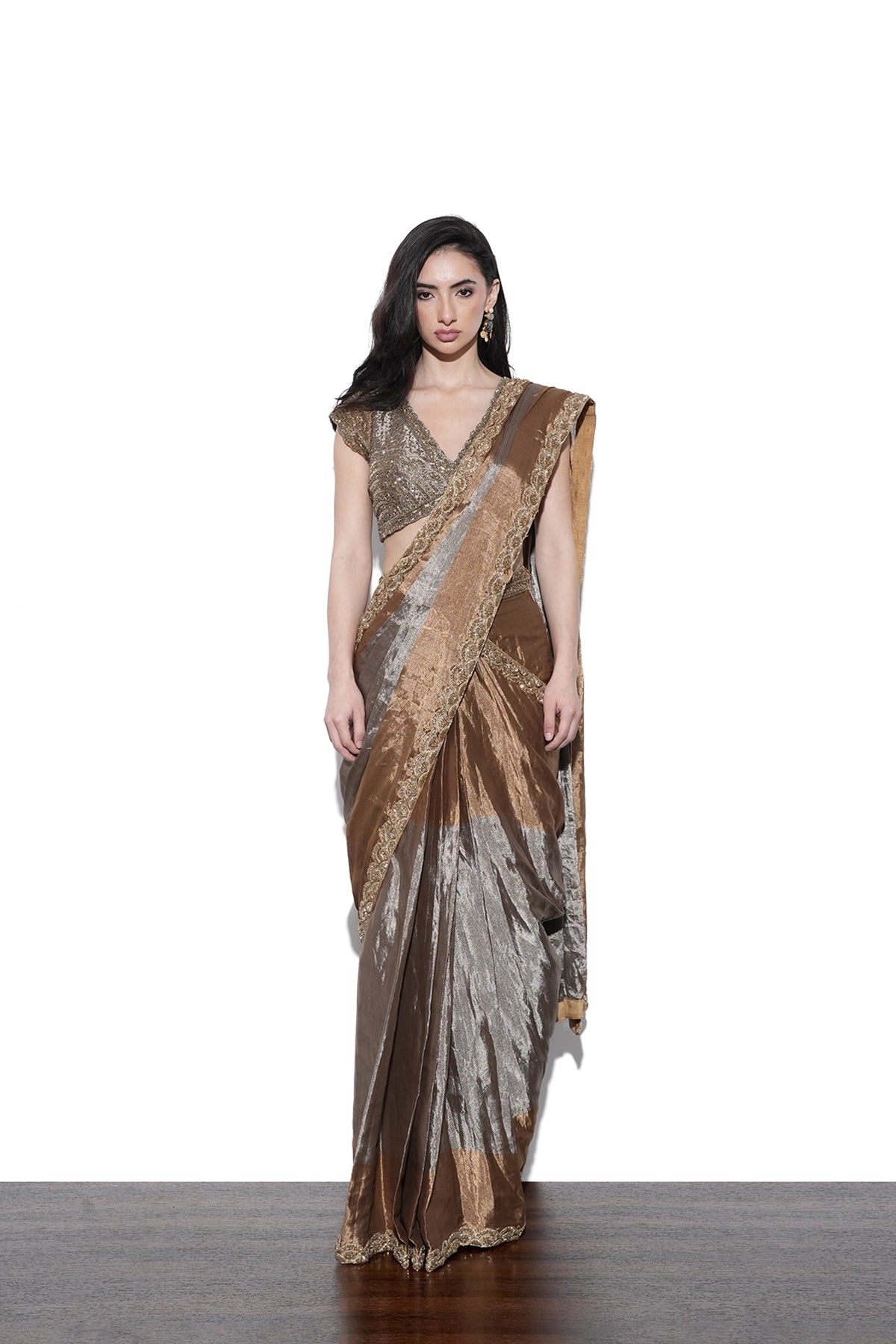 Dark Brown Pre-Draped Saree Set With Digial Printed Floral Blouse