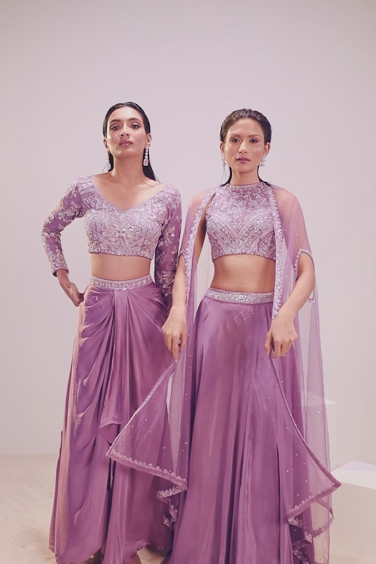 Featuring a Dark Mauve Circular Cut Skirt in Crepe With a Halter Neck Hand Embroidered Top Along With a Net Embroidered Cape