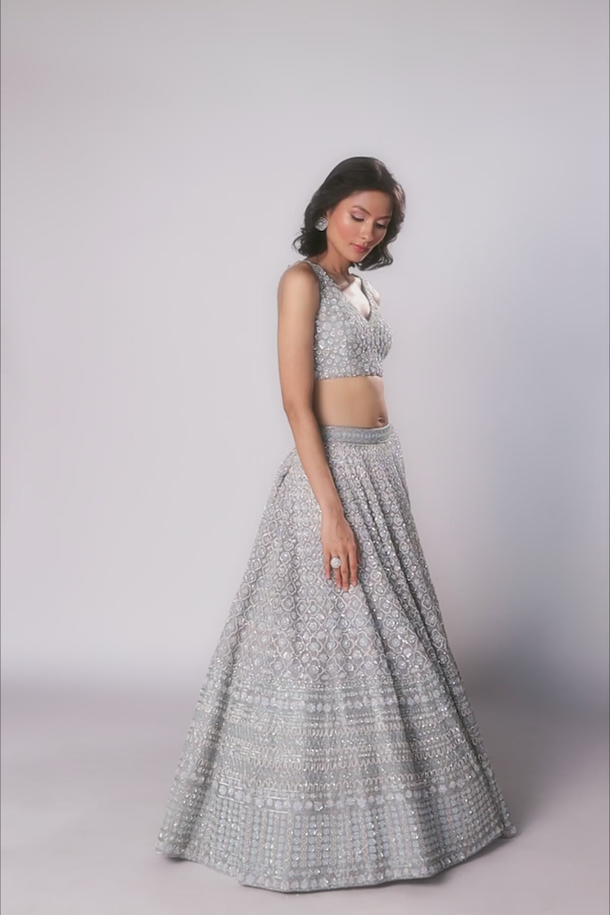 Featuring Our Stunner Lehenga in Light Grey Shade on Organza Embellished With Sequins, Cutdana, Salli and Beads Work. The Blouse is Sleeveless Along With a V-shaped Neckline. It is Paired With an Embroidered Organza Dupatta