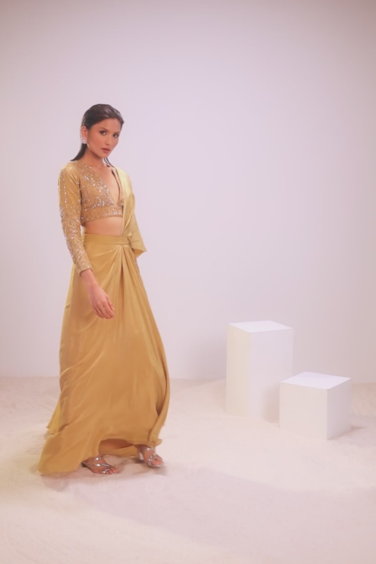 Featuring a Mustard Yellow Draped Skirt With a Hand Embroidered Raised V-neck Blouse