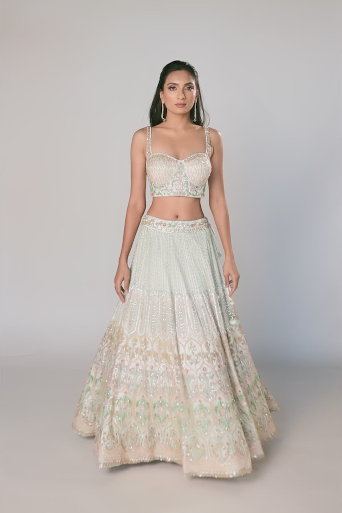 This Breathtaking Pista Hand Embroidered Lehenga Set is Embellished With Cutdana, Sequins, Diamond, Moti and Resham Work. The Embroidered Blouse Has a Sweet Heart Neckline Along With Straps. This Set Also Consists of an Embroidered Dupatta in Net
