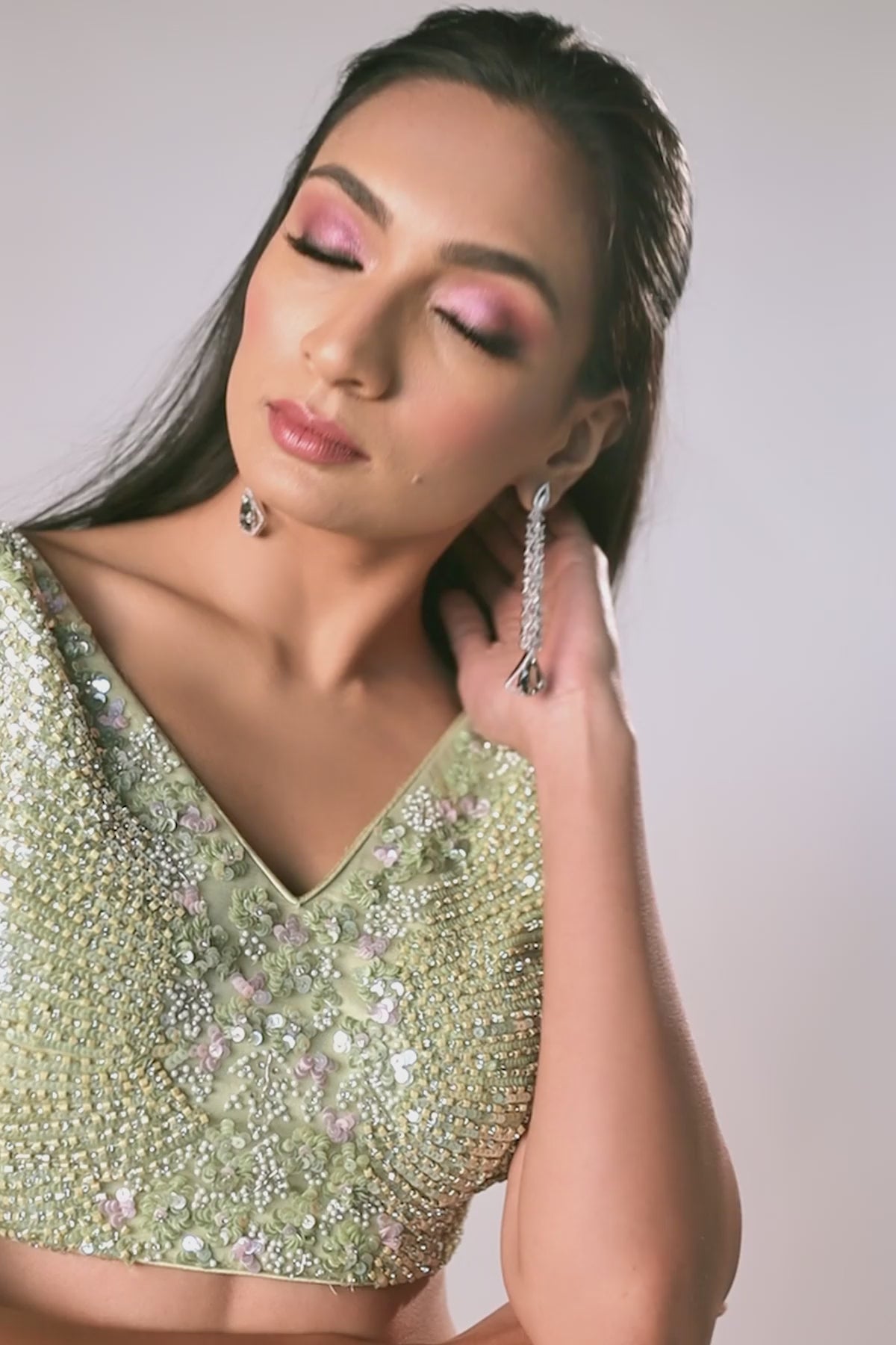 Featuring a Seafoam Green Lehenga Set in Net Along With Diamond, Cutdana, Sequins, Pearl and Bead Work. The Blouse is Sleeveless With a V-neckline.
