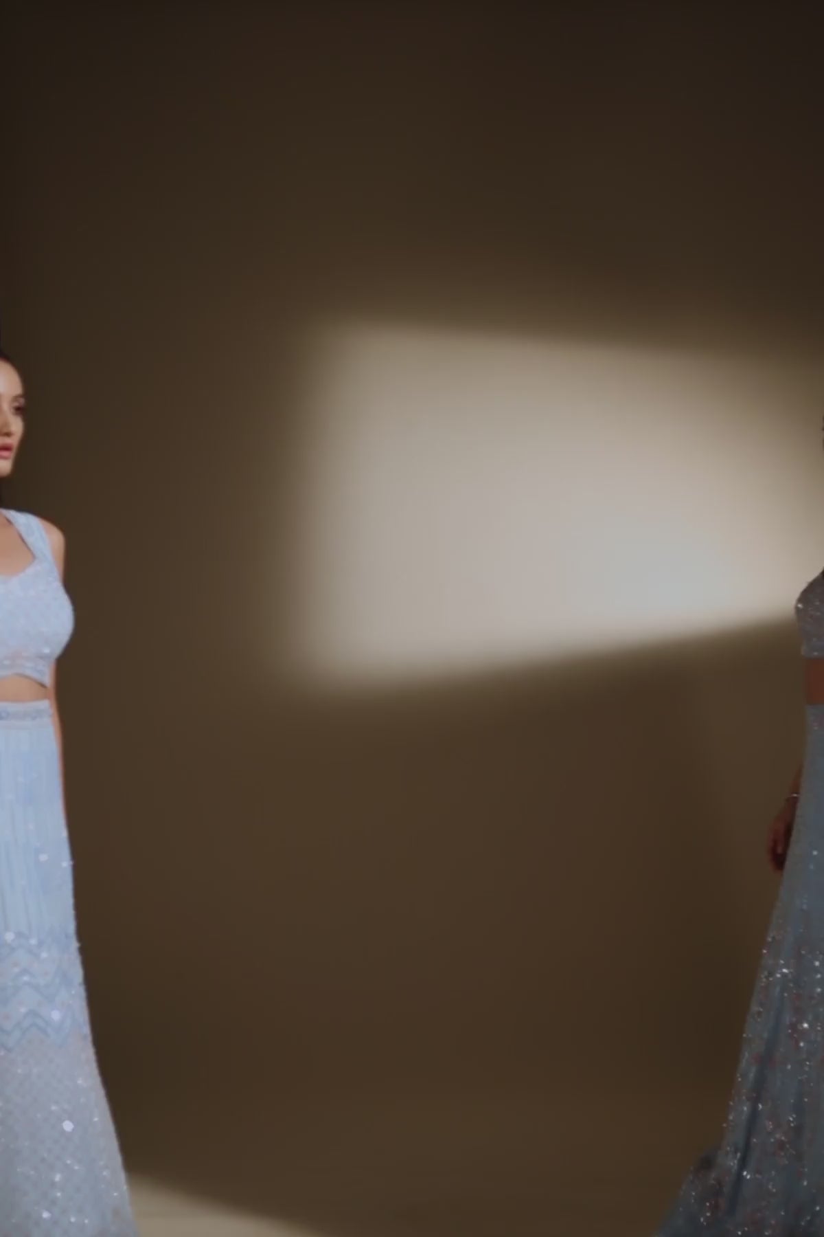 We Are in Love With the Pastel Trend and Round Necks and a Curved Blouse Hemline! This Organza Lehenga Shimmers It’s Way Through With Kardana, Salli and Pearl Work Over the Lehenga. A Very Free Flow Lehenga Which Let’s You Flaunt Your Dance Moves